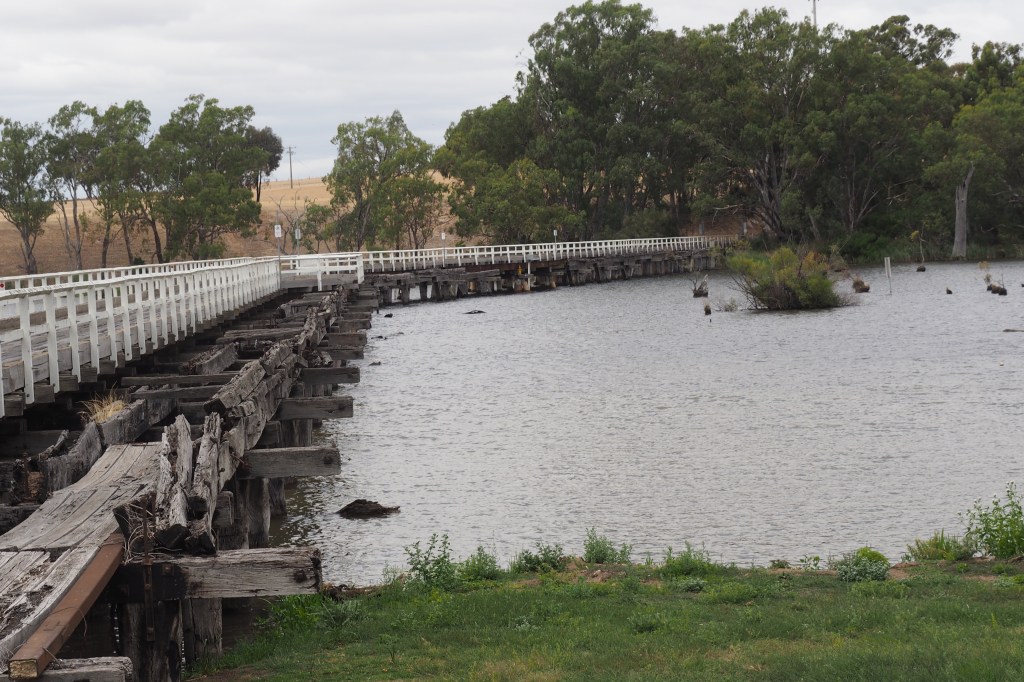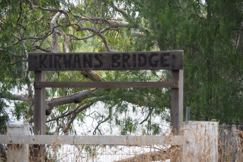 I did something the other day when I had visited Nagambie. I was heading out of town and saw the sign “Kirwans Bridge”. I passed the first sign and then when the second sign came up I just thought stuff it and turned left and drove up the dirt road. I pulled over to the side and let another car cross the bridge. Once he was half way I followed him. Heart in mouth, this bridge was rickety and coplonk, coplonk as the boards went up and down as my tyres crossed over. Once over the other side I pulled up and took some photos. Then again heart in mouth I waited till another car began to cross and followed them to the other side.