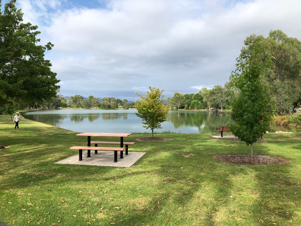 You can easily access the park from the freeway from Melbourne. You take the second exit to Wodonga, turn right at the lights then go under the bridge (Freeway) and turn right at the second and third exit. Plenty of parking all round the park and lake. Great place to stop on your way to Sydney or Canberra. Of course great to stop here on the way back home also.